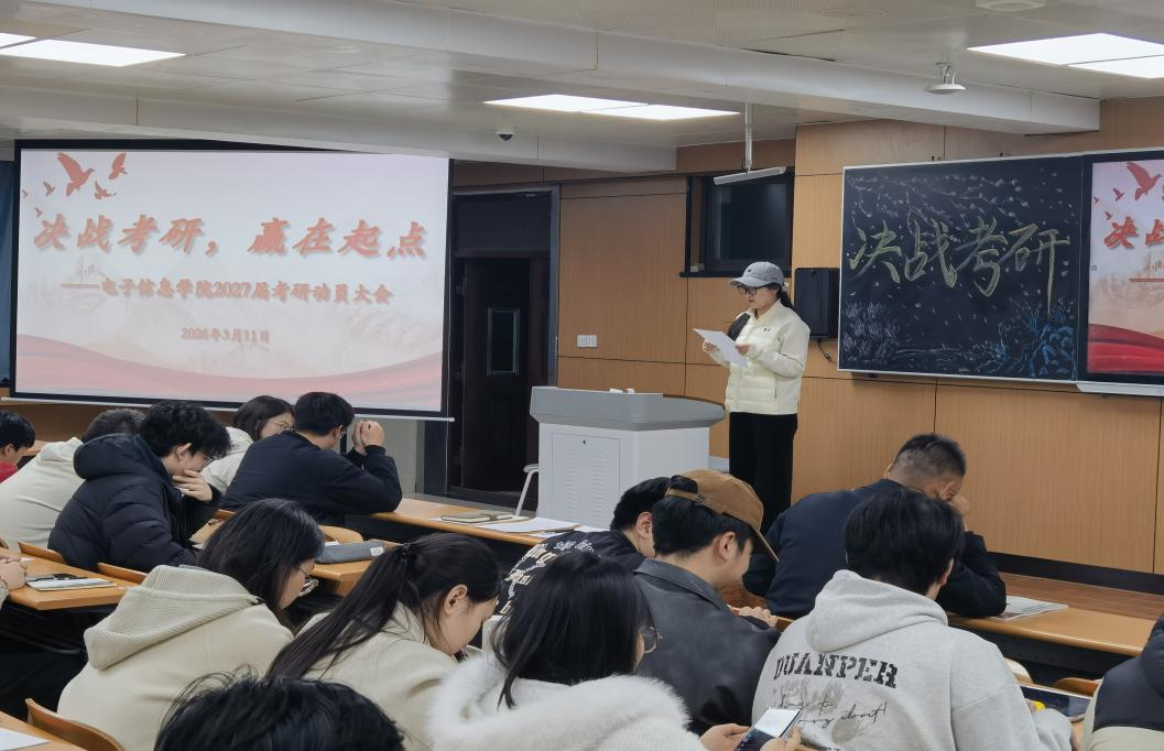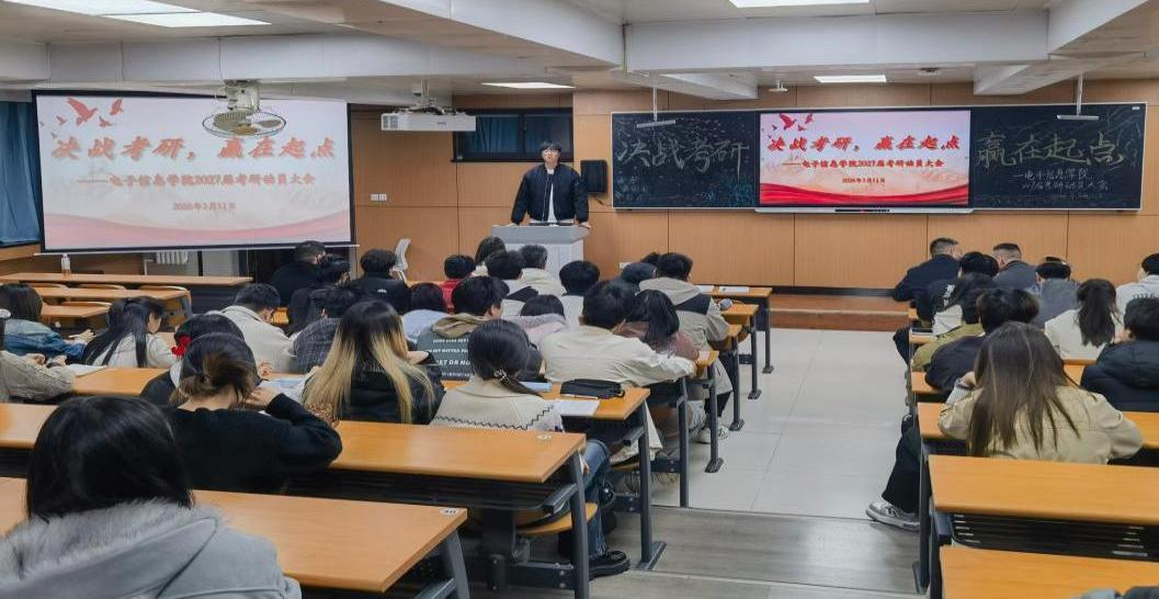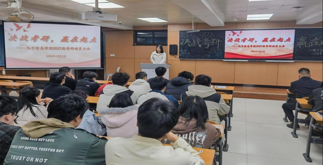 为进一步激发学生考研热情,明确备考目标与路径,强化考研指导服务,3月11日,电子信息学院在2222 教室召开2027届考研动员大会。学院学工办主任段领主持会议,学院相关老师及2027届有志考研学生共100余人参加会议。