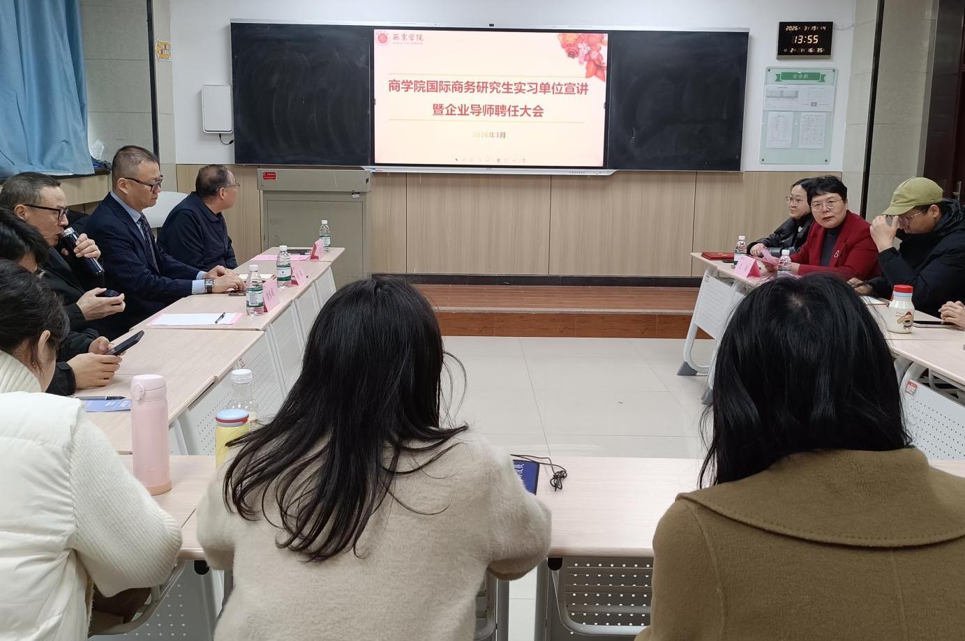 为深化研究生教育改革,构建“产学研用”协同育人体系,切实提升国际商务专业硕士培养质量,3月19日,商学院成功举办国际商务研究生集中实习宣讲暨企业导师聘任仪式。商学院副院长王颖主持会议,全意(陕西)进出口贸易公司总经理喻翔、学院研究生督导岳宏志教授、导师代表樊根耀教授及全体国际商务研究生参会。