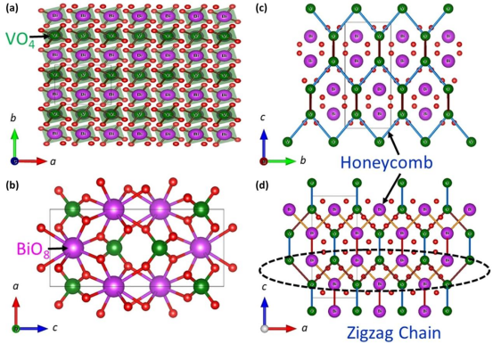 Figure1:(a–d) BVO化合物晶体结构在不同晶面上的投影。箭头指示蜂窝状晶格平面(c, d)。图(d)中黑色虚线圆角框标注的是由共棱连接的BiO₈多面体与VO₄多面体分别构成的一维锯齿链结构单元。