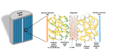 图 圆柱形锂离子电池(LIB)的结构以及每个组件中使用的构成元素示意图