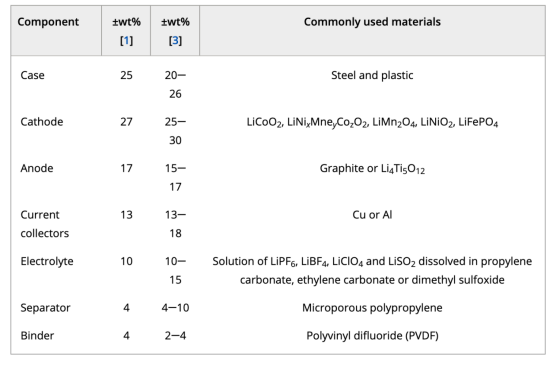 表1. 锂离子电池结构组件和材料