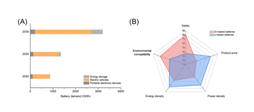 图1. (A) 2020至2030年间,能源存储系统、移动电子设备和电动汽车的预测能量存储需求(GWh)。此图已获授权使用,版权归英国皇家化学学会所有,2024年。(B)针对多个指标,锌基电池与锂基电池的比较。此图已获授权使用,版权归英国皇家化学学会所有,2024年。