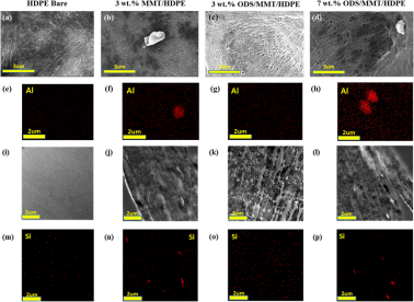 通过SEM和EDS图像分析(图2)证实了材料的分散情况。在未经处理的MMT/HDPE复合隔膜中,可观察到数微米大小的颗粒团聚体分散在样品表面,Al和Si元素的EDS结果也显示出局部聚集现象。而经过ODS处理的MMT/HDPE复合隔膜(ODS/MMT/HDPE)分散性明显改善:在3wt.% ODS/MMT/HDPE样品表面未观察到团聚颗粒,Al和Si元素的EDS分析也显示出良好的分散性。但在7wt.%高填充量的ODS/MMT/HDPE样品中,尽管经过硅烷处理,仍出现了颗粒团聚现象,这归因于填料含量过高导致的分散困难。