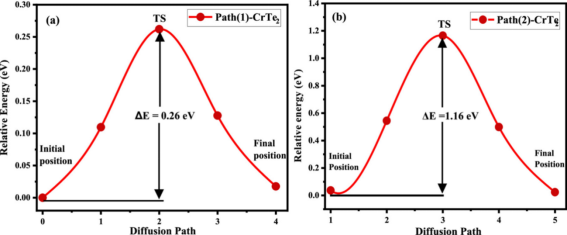 本研究采用弹性带climbing image nudged elastic band (CI-NEB) 方法系统计算了金属原子在CrTe2中的扩散势垒及最低能量路径。该方法通过将反应物与产物状态分解为多个中间态(images),并沿反应路径弹性拉伸寻找最低能量路径。如图10所示,针对Li离子在CrTe2中的扩散,发现两条典型路径:(1) 沿y轴方向在上下层六元环中心迁移的势垒仅为0.26 eV(图10a),与商用石墨(0.22-0.40 eV)和Si3N4(~0.24 eV)相当,Hirshfeld电荷分析证实该路径中Li会将电荷转移至Te原子;(2) 沿x轴左右扩散的势垒高达1.16 eV(图10b),但该路径却成为Al离子扩散的最优通道(势垒最低)。