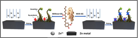 图1.我们通过将新鲜生姜(其主要成分为(5S)-5-羟基-1-(3-羟基-4-甲氧基苯基)癸烷-3-酮,简称6G)融入水合ZnSO4电解液中,有效降低了水活度并抑制了锌枝晶的形成。该简易方法表明,6G电解质添加剂不仅改变了初始氢键,还形成了独特的Zn2+溶剂化壳层。