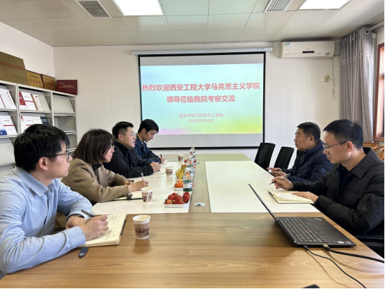 3月10日下午,西安工程大学马克思主义学院院长郭松、党委副书记傅博娜等一行来我院考察交流,双方围绕马克思主义学院建设发展中的共性问题及思政课教学改革展开深入交流。我院院长杨洪教授偕领导班子成员热情接待了考察组一行。