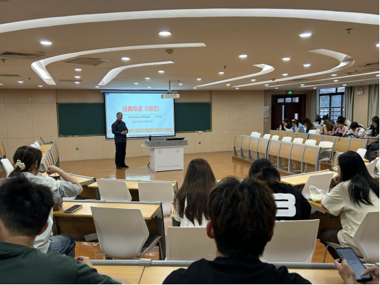 5月8日下午,“西京经典导读”第217期在图书馆202报告厅举行。本场报告由马克思主义学院教师于跃进主讲,他导读的是中国最早的一部诗歌总集《诗经》,传媒学院100多名学生参加了本次导读活动。