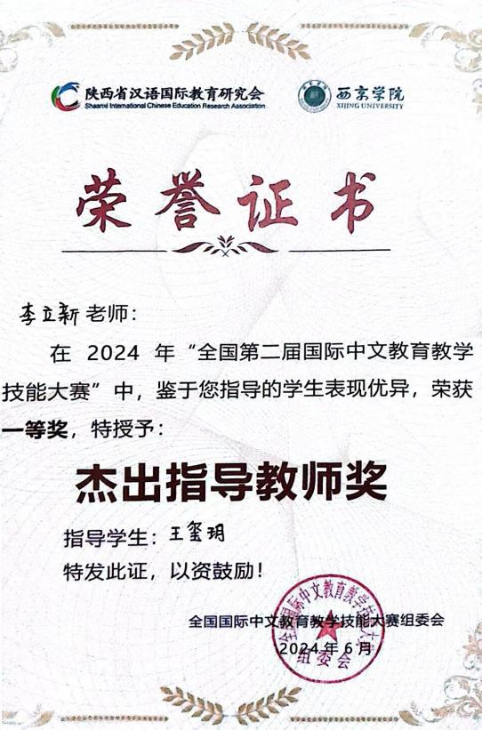 神禾塬顶,有这样一群人,他们秉承“诚健博能”校训,刻苦奋进,勇担时代使命,以实际行动践行榜样力量。自17年前进入西京学院工作以来,外国语学院的李立新老师一直坚守用爱心浇灌学生成长,以热爱、奋斗、担当和坚持彰显西京学院教师的风采。2024年,她指导多名学生获得全国第二届国际中文教育教学技能大赛全国一等奖和全国优秀奖,因此荣获“卓越指导教师奖”“优秀指导教师奖”。