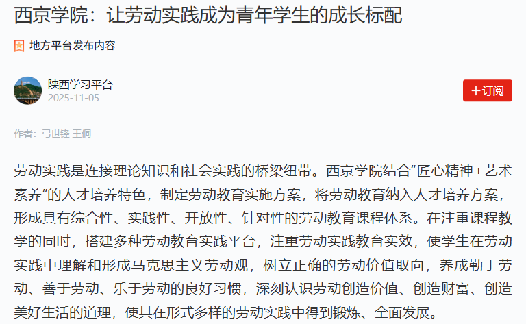 劳动创造幸福,奋斗成就梦想。劳动实践不仅是提升学生能力的“练兵场”,更是涵养学生品格的“营养剂”。西京学院让学生在劳动实践中学会动手、懂得珍惜、理解责任……当他们走出西京园时,手里握的不仅是一张毕业证和学位证,还有一双会做事的手、一颗能共情的心、一份敢担当的气魄,这正是学校送给西京青年学生最深情的“成长礼物”,让每一名学生在挥洒汗水中读懂生活的真谛,在劳动实践中收获人生的丰盈。