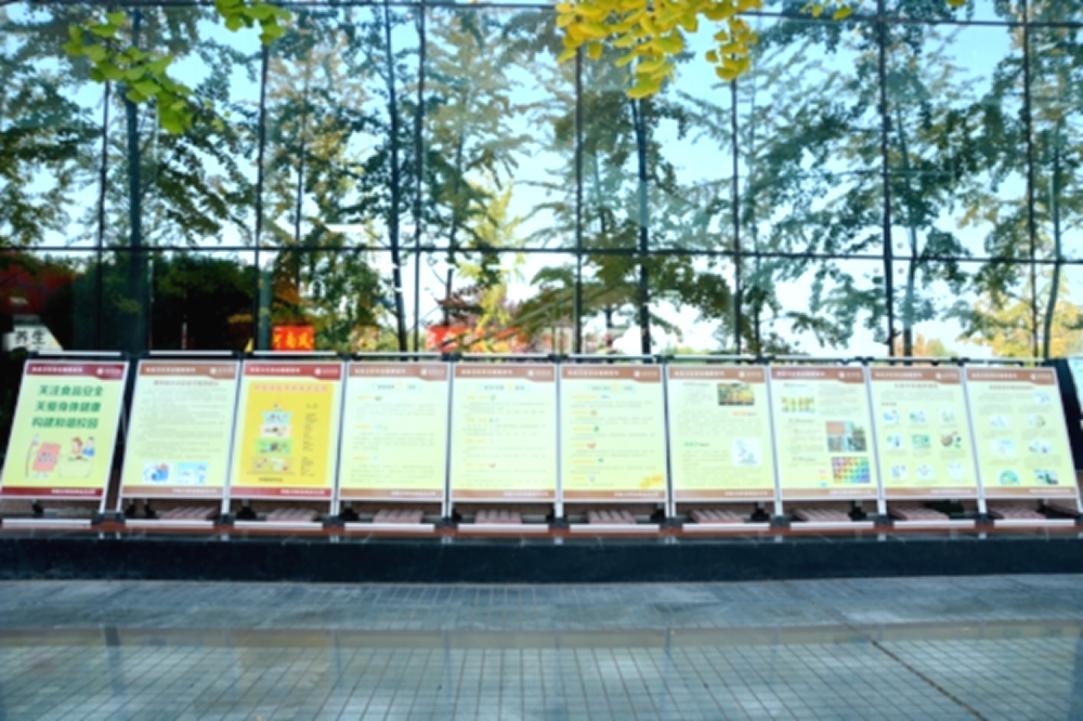 通过展板宣传食品卫生安全健康知识。华煜公司饮食商业分公司在璞玉楼餐饮中心门口放置了10块宣传展板,开展食品卫生安全健康知识宣传。内容包括中国居民平衡膳食宝塔、健康晚餐三大原则、营养早餐四要素、理想午餐的六种食物、烧烤类食品的危害、腌制类食品的危害、食源性疾病的预防和轻微食物中毒怎样自救等内容,提醒广大师生关注食品安全,关爱自身身体健康。