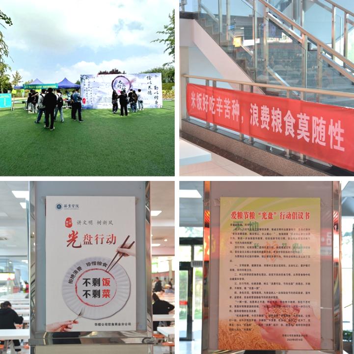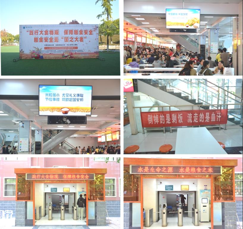 通过多种方式开展主题宣传。一是在璞玉楼餐饮中心门前设置桁架,印制此次全国粮食安全宣传周的主题和第43个世界粮食日的主题和粮食分类知识。二是通过璞玉楼餐饮中心室内的电视屏幕轮流播放“中国粮食,中国饭碗”和“米粒虽小,尤见礼义廉耻;节俭事微,可助定国安邦”等的视频图片;三是在璞玉楼中心室内电梯旁、楼梯边悬挂横幅“倒掉的是剩饭,流走的是血汗”“米饭好吃辛苦种,浪费粮食莫随性”。四是利用分布在学生公寓楼前的电子屏展示全国粮食安全宣传周的主题和第43个世界粮食日主题。五是利用学生公寓楼的电视机展示“节约粮食,从我做起”“勤俭节约,浪费可耻”等内容。