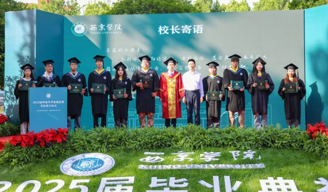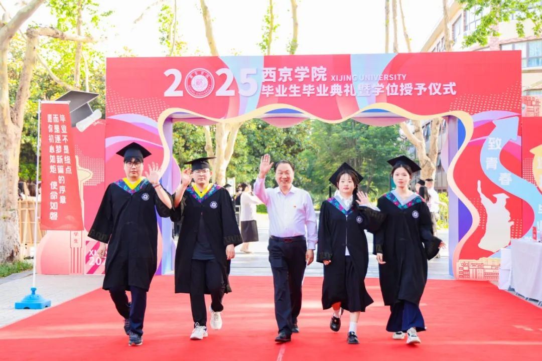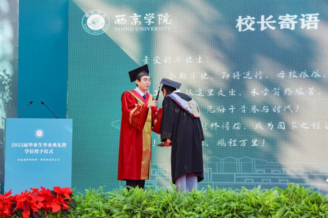 拨穗正冠,扬帆远航。校学位评定委员会副主任委员、副校长黄文准教授为学位获得者扶正流苏。随着流苏轻轻拨动,无数个日夜耕耘在这一刻绽放光芒,西京的学脉也在接力中生生不息。