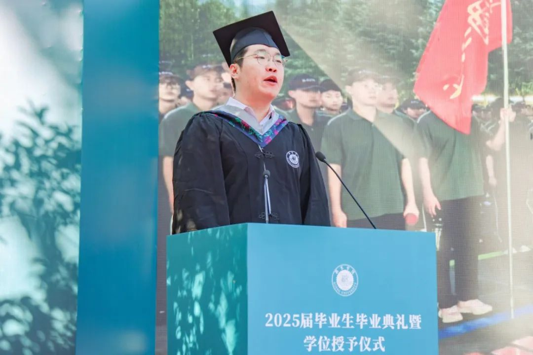 落其实者思其树,饮其流者怀其源。商学院电子商务专业黄宏轩感谢学院和各位老师的培育之恩,感激全院教职员工为同学们的倾心付出。他回顾了自己从“迷茫新生”到“西部计划践行者”的蜕变历程,生动讲述了他在西京求学的所见所感。他寄语同学们:真正的青春从不在安逸中沉沦,而在与命运的较量中闪光;真正的成长从不在顺境里止步,而在翻越一座座名为“不可能”的高山时绽放!