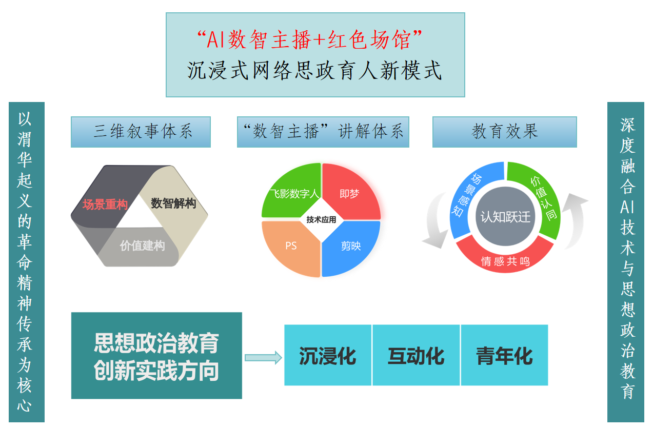 技术应用层面创新构建“数智主播”讲解体系,采用飞影数字人的动态捕捉与语音合成技术,以青年化的视听语言重新编码革命史料,同时利用即梦软件(Dreamina)、PS工具、剪映等工具,制作时长约1分钟的红色教育短视频,视频通过AI数智主播的引导式讲解,生动讲述渭华起义的革命历史、英雄事迹及其时代精神,为青年学生提供了一种更具吸引力、更便于网络传播的红色文化学习体验,使学生在1分钟内完成“场景感知-情感共鸣-价值认同”的认知跃迁。案例通过AI技术让红色故事更贴近青年话语,是思政教育拥抱数智时代、拓展网络育人新渠道的一次积极实践。