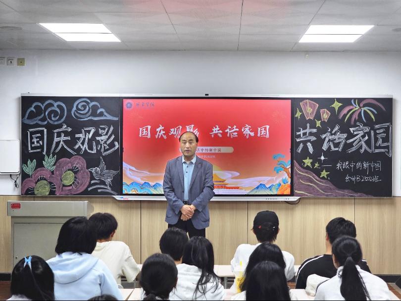 ——主题班会,在交流互动中凝聚奋进力量。围绕“庆祝新中国成立76周年”这一主题,开展形式多样的主题班会,如会计学院会计学2502班辅导员孙宏斌组织了“我眼中的新中国”主题班会,同学们观看了国庆主题纪录片《千古山河在》,光影流转间,新中国从百废待兴到繁荣富强的沧桑巨变在银幕上生动展现,一幅幅珍贵的历史画面、一段段感人的奋斗故事,让学生们直观地了解新中国成立76年来的发展历程和伟大成就,增强民族自豪感和自信心。“深情讲述祖辈口中物资匮乏年代的艰辛,与今日家庭丰盈生活的鲜明对比”“家乡从闭塞乡村到现代化城镇的蝶变”“家中几代人职业选择变化,折射国家产业升级与个人发展机遇的拓展,我要努力奋斗、成才报国”……同学们在分享交流环节用真挚的情感、朴实的语言,表达对伟大祖国的热爱和对未来的憧憬,展现出新时代青年的责任与担当。