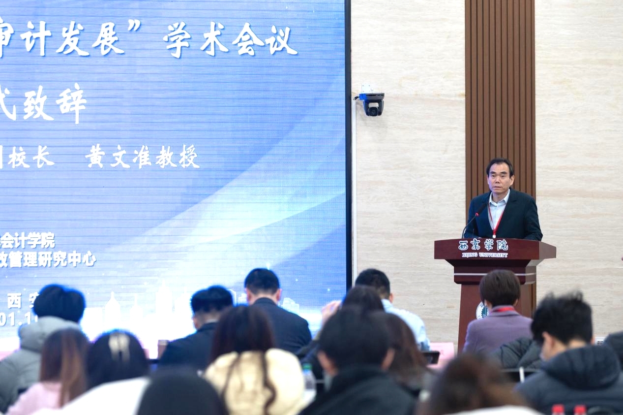会计学院院长李海霞教授主持会议并介绍嘉宾。西京学院副校长黄文准教授致辞指出,以人工智能、大数据为代表的科技革命正推动会计审计领域经历深刻变革,面临理论、教育及职业伦理等多重重构。他还介绍了西京学院的发展历程、办学特色及会计审计学科在专业建设与科研方面取得的成果。