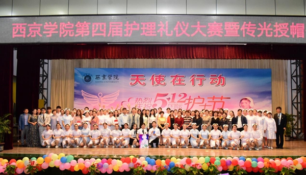 为庆祝第107个国际护士节,5月11日晚上,西京学院第四届护理礼仪大赛暨传光授帽仪式在小礼堂举行。陕西省首位南丁格尔奖获得者、西安交通大学第二附属医院杨惠云老师应邀参加了此次活动,参加此次活动的校外护理专家还有:西安交通大学医学院护理系教授顾炜、陕西省友谊医院护理部主任侯诗箐、西安市第三医院护理部主任吴利娜、陕西省第四人民医院护理部主任袁艳奇、长安医院护理部主任李迎春。我校副校长王晋荣、教务二处处长边伟、允能书院院长程永清、医学院院长张煜星及2017级500多名护理专业学生参加了此次活动。