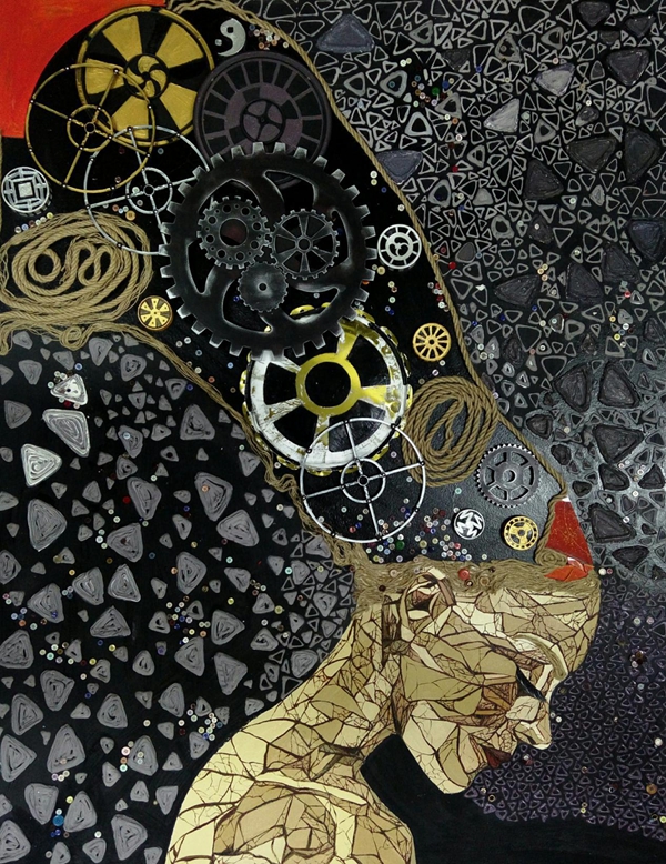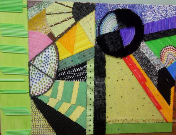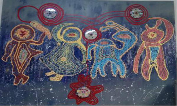 材料应用:木工板,丙烯颜料,麻绳,箱纸板,立德粉,扣子,玻璃,瓶盖,皮纸,铁盖,飞盘