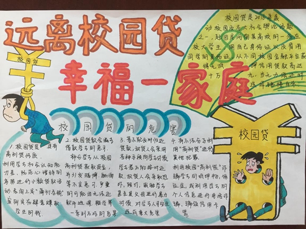 开展“远离校园贷,幸福一家人”手抄报活动。3月10--14日,至诚书院15级各专业组织开展了“远离校园贷,幸福一家人”手抄报活动。各班级的手抄报内容丰富,有的讲述了真实的案例,有的描述了当下校园贷的多种形式途径,有的直接讲明了校园贷的危害。此次活动通过绘制手抄报这种形式,对学生进行了直观形象的教育,提升学生的安全防范意识,倡导理性消费,营造积极、健康、合理的消费观念,增强学生的家庭责任感,使其自觉远离校园贷行为。