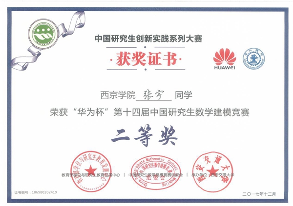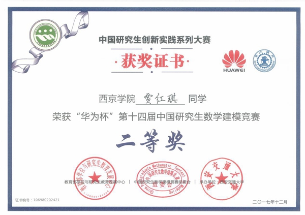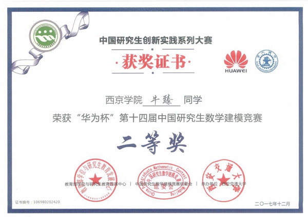 全国研究生数学建模竞赛是教育部学位与研究生教育发展中心主办的“全国研究生创新实践系列活动”主题赛事之一。“华为杯”第十四届中国研究生数学建模竞赛于2017年9月16日至20日在全国同时举行,全国包括香港、澳门在内的32个省、市、区437个研究生培养单位10454队研究生交卷参赛,其中博士生约1500名。经专家委员会全体委员并特邀有关专家教授471人历时一个半月的评审,通过网上和集中评审两个阶段评选出获全国一、二、三等奖的参赛队,按竞赛章程,评选出一等奖150队,二等奖1383队,三等奖2085队。本届比赛,参赛总人数和获奖团队数均创历史新高,参赛研究生专业领域广,十三个学科门类全部覆盖。