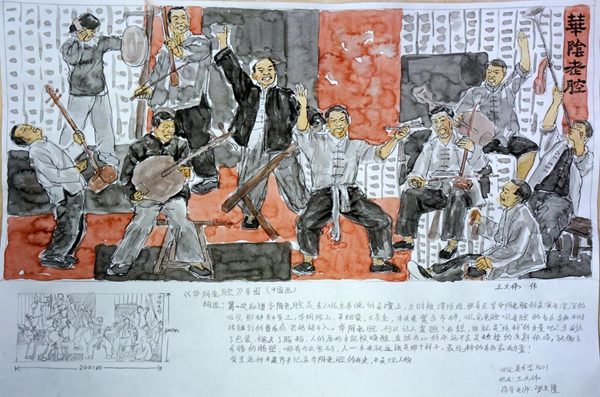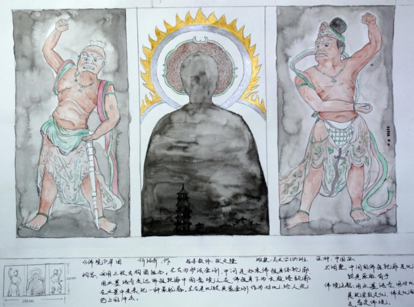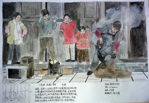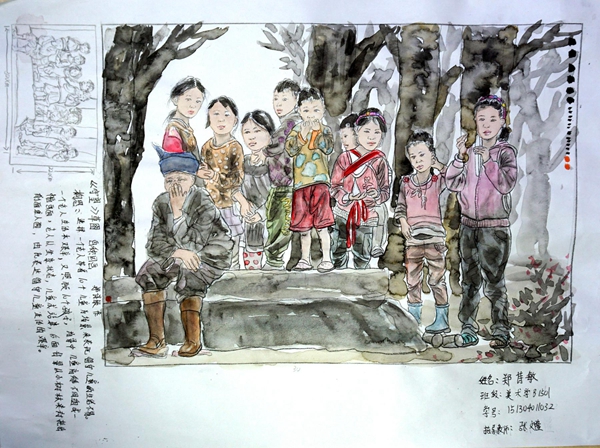其中,何绍奇同学的宗教题材创作草图《佛境》选取麦积山石窟为主要创作素材,用写实风格来表现护法塑像,用抽象水墨因素来表现佛像剪影,将两者巧妙的结合到一起,画面统一、和谐,表达出了佛境这一主题。王大伟同学的风俗题材创作草图《华阴老腔》以陕西华阴老腔这一非物质文化遗产为创作素材,用写实风格表现主体人物,以具有构成因素的色块和长篇隶书老腔简介为背景,多种元素有机结合,画面冲击力强,继承传统的同时又具有新意。卢文倩同学的现实主义题材创作草图《儿时•味道》以儿时回忆中爆爆米花的场景为素材,用写实的风格来表现,画面真情流露,真实感人。郑诗敏同学以亲身经历的留守儿童这一群体为素材创作了四幅草图,其草图《守望》用写实风格表现了一位老人和十个留守儿童在村口守望的场面;草图《关注》用十几双留守儿童的脚和破旧的鞋为画面四边,用儿童天真的面庞为画面中心,组成了具有构成意味的画面,意图唤起观者的关注,情感真挚,汇报期间一度哽咽,感人至深,让人落泪。还有多位同学的创作草图构思精巧、刻画认真。