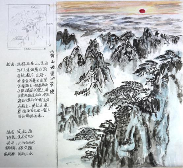 美术学1501班每位同学分别从创作构思、素材收集、创作小稿、创作速写、创作草图等方面进行了汇报展示。同学们的创作草图选题广泛,涉及到现实主义题材、宗教题材、历史题材、少数民族题材、风俗题材、乡村题材、城市题材、自然风光题材、浪漫主义题材、电影题材等多种题材。预表现技法包括了油画和中国画,表现对象包括了人物、风景、花鸟、山水、器物等。