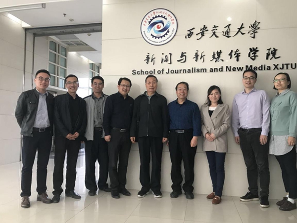 3月29日上午,传媒学院院长张西静、新闻专业学科带头人高有祥、新闻教研室主任樊水科、网络与新媒体教研室主任李政、教务科科长郝周成一行赴西安交通大学新闻与新媒体学院开展关于校企协同育人方面的专项调研。西安交通大学新闻与新媒体学院院长李明德,党委副书记张立、陈积银副教授、传播学系主任陈强热情接待了我校调研组一行。