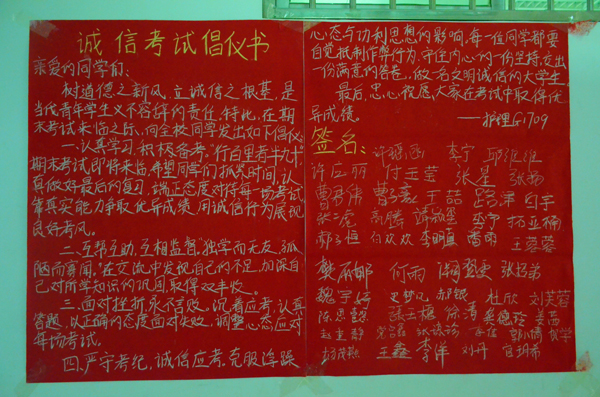 ——“树道德之新风,立诚信之根基”诚信考试倡议书。诚信考试,是做人之根本,道德之底线。为营造良好校风学风,加强纪律教育,引导广大学生树立正确的价值观,培养自立自律、刻苦学习的作风,塑造高尚的品格,认真复习,诚信考试,书院向全体学生发出诚信考试倡议:全体学生在各班宣传委员组织下,在以“诚信考试”为主题的倡议书上留下各自的签名,表明诚信考试的信念及积极应考、拒绝舞弊的决心。