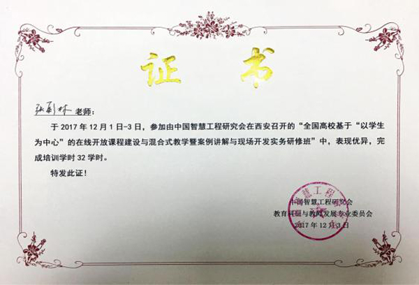 西京网讯:近日,由中国智慧工程研究会举办的“全国高校基于‘以学生为中心’的在线开放课程建设与混合式教学暨案例讲解与现场开发实务研修班”在西安开班,来自全国10余所高校的50余名骨干教师参加培训。我校会计学院教师张彩林参加此次培训,并因优异表现和认真态度,获得会务组颁发的结业证书。