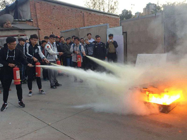——初起火灾扑救演练。在对学生们进行充分的消防理论知识培训后,通过实践操作演练,教会学生们灭火器的使用方法,掌握初起火灾扑救措施、突发火情如何带领同学们有效疏散。