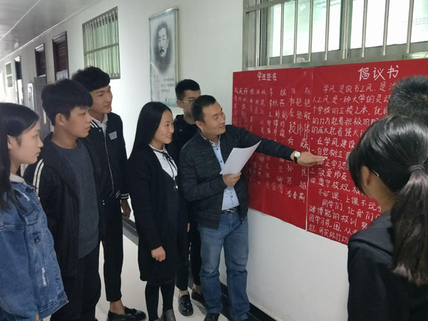 ——10月11日晚,允能书院各班举行以‘规范我校教学质量,加强学风建设’为主题的班会。各班以精美的PPT课件,整洁干净的黑板书为本次班会传递了正能量,同学们认真听讲,互动激情,通过本次班会的开展使同学们明确了新学期的学习目标,为加强班级学风建设和创建文明校园做到良好效果。同时书院院长杨德森深入各班级聆听班会,并对班会进行督导检查。