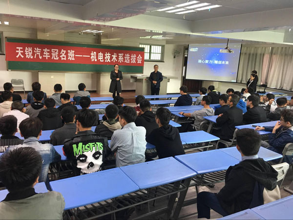 首先,桑敏给同学们观看了陕西天锐汽车(集团)销售服务有限公司的宣传片,接着给同学们详细介绍了公司的创立、发展、壮大、现状和前景,向同学们宣讲了此次冠名班选拔要求、选拔方法、选拔制度等,并用生动感人的实例,激发同学们积极参加天锐冠名班选拔的热情,让同学们看到自身发展的方向,并现场与同学们进行互动,对同学们提出的问题进行耐心的解答。此次选拨会通过现场面试、笔试,最后30名同学成功入选冠名班。