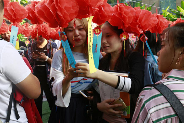 猜灯谜,喜迎中秋,张灯结彩。灯笼、谜语,两个简单的元素构成了中秋最简单的娱乐活动!红色灯笼高挂,彩色纸条飘扬。每一张纸条都有谜语,有奖竞猜。在这里,学生们开动脑筋、集思广益,拿下一个个难题!猜中的同学都有一次抽将机会,奖品包括太白山景区门票、毛绒玩具、中国结吊坠等。