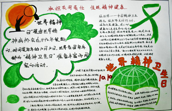 此次活动还有学生亲手制作有关精神卫生主题的手抄报,通过手抄报制作活动,同学们对心理健康相关知识有了进一步的了解,提高了大家对精神卫生于个人的重要性认识,同时了解了缓解负面情绪的常见措施。大力宣传了心理健康、精神卫生的知识,为营造良好、和谐的校园气氛而携手并进。