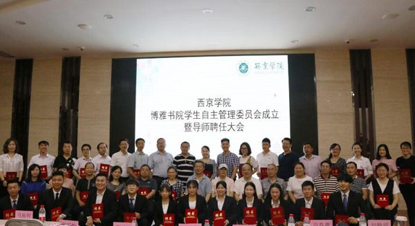 西京网讯:为了强化学生自我教育、自我管理、自我服务、自我监督的主体地位,同时发挥专业教师在大学生学业发展过程中的指导作用,完善导师制度,依据《中共西京学院委员会关于深化学生管理体制改革,加强学生自主管理工作的实施方案》和《西京学院学业导师工作条例》的文件精神,西京学院博雅书院于6月19日19:00在第二会议室隆重召开“博雅书院学生自主管理委员会成立暨导师聘任大会”。大学生发展与服务中心主任张京鹏、设计艺术学院院长臧卫军、新闻传媒系主任张西静、外语系主任谢俊平、博雅书院院长冯春燕、副院长王培涛、大学生发展与服务中心事务科和发展科科长童绥勇、刘静超,以及敦建勇等27位受聘导师和应邀参加了本次大会。