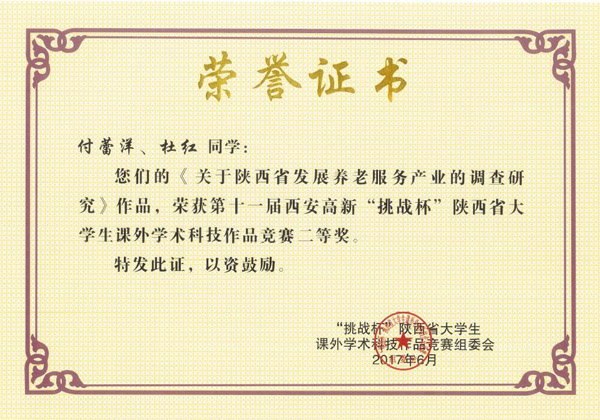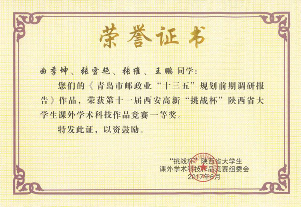 西京网讯:近日,第十一届西安高新“挑战杯”陕西省大学生课外学术科技作品竞赛结果出炉。由我校会计学院审计专业硕士研究生曲季坤等主持申报的《青岛市邮政业“十三五”规划前期调研报告》和付雷洋等申报的《关于陕西省发展养老服务产业的调查研究》分获陕西省大学生课外学术科技作品竞赛一、二等奖。