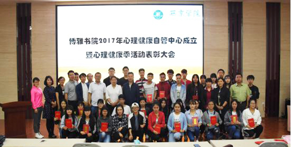 此次活动由博雅书院心理辅导站老师方长乐主持。活动第一项由博雅书院院长冯春燕宣布书院心理健康自管中心成立及聘任决定。聘任博雅书院心理辅导站站长为心理健康自管中心指导老师,聘任新采1601班秋升为心理健康自管中心主任,聘任环境设计1604班齐文炜、英语1602班闫钰、视传设计G1601班马梁皓为心理健康自管中心副主任,并对他们发放了聘书,心理健康自管中心主任秋升就如何开展工作作了发言。第二项由博雅书院心理辅导站站长蔺致远老师就书院心理健康季工作作总结发言。第三项由各位领导对在心理健康季系列活动中(心理脱口秀、心理漫画展、心理外文电影赏析、班级和宿舍心理委员团训等)表现突出的老师和学生进行了表彰 。