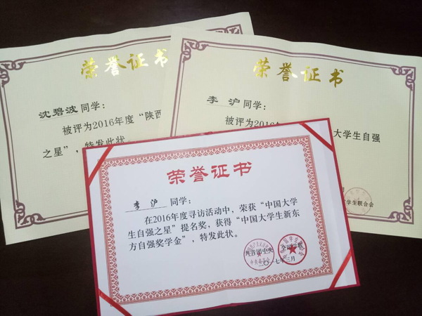 西京网讯:近日,团省委、省学联公布了2016年“陕西省大学生自强之星”获奖名单,经个人申报、校院两级遴选推荐、网络投票及团省委评审,万钧书院李沪、沈碧波两位同学脱颖而出,荣获“陕西省大学生自强之星”。同时,李沪同学被推荐至团中央和全国学联参加2016年“中国大学生自强之星”提名奖评选活动,喜获“中国大学生自强之星”提名奖,获得“中国大学生新东方自强奖学金”。