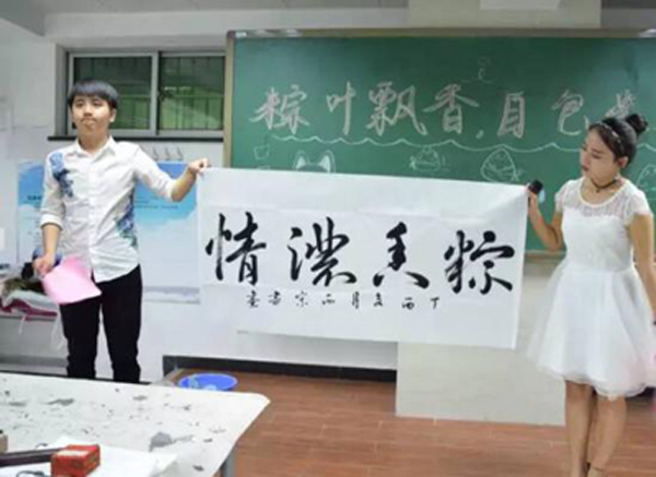 随后,我校书画协会会长严斌进行了书法展示,他讲到,书法艺术作为中国传统文化的一个重要组成部分,有其独特的艺术魅力。书法艺术的创作过程和端午节包粽子的过程是一样的,都是一种抒发情感的过程,都是中国传统文化,都值得我们传承和弘扬。
