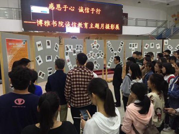 同学们认真观看摄影展,互相学习,冯春燕说,感恩在于心,诚信在于行,感恩诚信,不在豪言壮语,而在于实实在在、一点一滴的言行和举止。同学们一致表示受助于国家和学校,更要积极服务社会、回馈国家。此次活动将诚信教育转化为学生自觉的素养与行为,使同学们真正理解如何以诚立身、感恩知恩、自强成才、回报社会。
