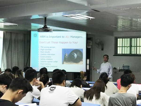 傅日源博士分别向酒店管理、市场营销、电子商务、旅游管理专业学生讲授了领导力、团队建设、知识创新、人力资源管理等方面的最新动态和相关知识。讲授过程中,教授以学生为本,尊重学生的想法,频繁与学生互动,幽默的教学风格使课堂中笑声一片。