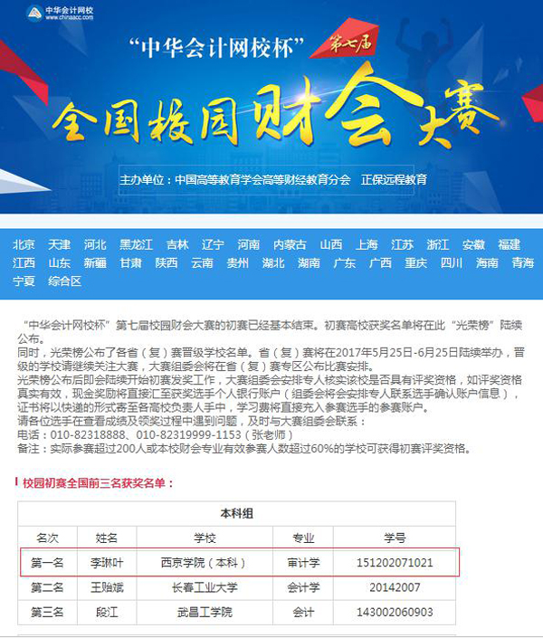 西京网讯:5月25日,从“中华会计网校杯”第七届全国大学生校园财会大赛组委会传来喜讯,我校会计学院审计学1501班李琳叶同学以总分98.4分(满分100分)的超高分数,获得初赛本科组全国第一名的好成绩,并帮助我校成功晋级省级复赛。这是我校继去年获得该项赛事全国第一名后,成功卫冕,并打破去年由我校参赛选手保持的全国第一名98分记录。