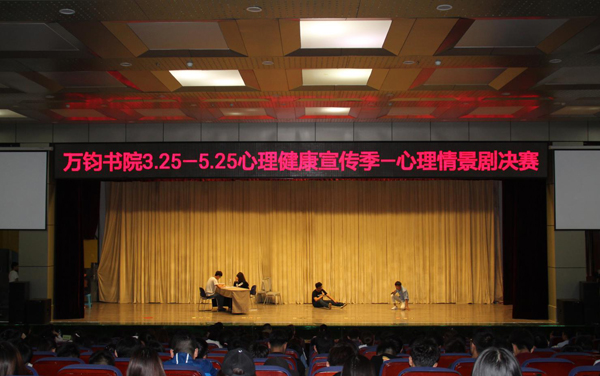 西京网讯:为了提高大学生对心理问题的认识,增强处理问题的能力,针对当下大学生的心理敏感话题和在生活中所遇到的问题,反映其精神面貌和心理成长历程,同时积极响应心理健康宣传季,5月10日下午,万钧书院心理情景剧决赛在小礼堂举行,来自书院的七个辅导员代表队伍进行激烈角逐。我校大学生发展与服务中心张京鹏主任、心理中心李娜老师、博雅书院心理辅导站站长蔺致远老师、万钧书院鹿秀娟老师担任了此次评委,万钧书院全体辅导员、书院各班级心理委员、宿舍心理委员和学生代表参加了此次活动。