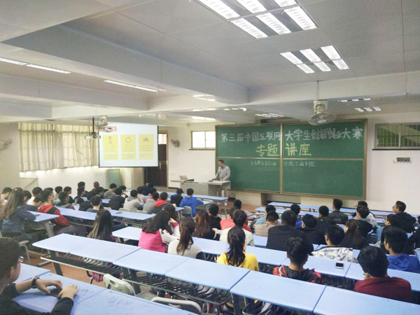 邓勤利主持了此次大赛启动仪式,程永清宣布了本次大赛的主题:搏击“互联网+”新时代,壮大创新创业生力军,并宣读了“教育部关于举办第三届中国‘互联网+’大学生创新创业大赛的通知”,邓海生做了报名动员讲话,他指出,“互联网+”大赛为广大学生提供了一个锻炼、成长的机会,大赛平台不但有助于让学生们通过学科交叉、思想交叉,不同文化背景的冲撞,产生更好的想法,更为对创新创业有兴趣的同学,提供了深入了解行业发展趋势,接触更多优秀人才的机会,对在校大学生的能力提升和境界开拓,都是很有帮助的。普凡信息技术有限公司总经理黄健做了专题讲座,讲解了上届大赛前3名项目的创意。