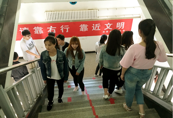 至诚书院学生会的干部们在教学楼的楼梯上设置了红线,注明行进方向,并挂起“文明靠右行”的宣传语,引导同学们上下楼梯靠右慢行;同时在楼道里也张贴了“轻声细语靠右行”的标语,提醒过往同学注意文明礼貌,不要大声喧哗,追逐打闹,影响他人。
