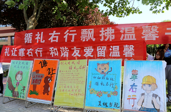 在放学高峰期,分团委和学生会的干部们当起了“文明行动”的志愿者,在教学楼及宿舍楼前拉起了红线,并在餐厅楼梯和主要的路段竖起了宣传牌,引导学生自觉靠右行,并及时制止逆行等不文明的现象。