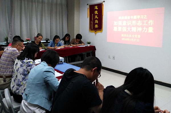 4月27日下午,南洋社区分党委在1235会议室举行意识形态工作会。会议邀请校党委宣传部部长弓世锋作了题为“加强意识形态工作,凝聚强大精神力量”的专题报告。南洋社区分党委委员、全体党员、辅导员参会。会议由社区分党委书记庞舒月主持。