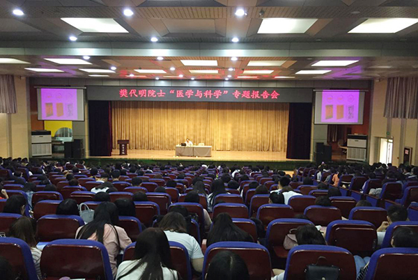 樊代明院士结合自己多年医学理论研究和临床实践,以医学与科学的关系为主题,介绍了三千年来人类社会医学的发展进步,取得的成果和遇到的挫折,当前医学发展的总体方向。重点阐述了国内外护理学发展状况和趋势,国内外护理专业的区别,护士在医疗中的重要地位和作用,以及护理专业在整合医学发展中的改革变化等内容。樊院士的报告深入浅出、条理清晰、内容丰富、切合专业实际。尤其他将纷繁复杂的医学、护理学理论用生动幽默的语言表达出来,激发在场师生兴趣,赢得师生阵阵热烈掌声。